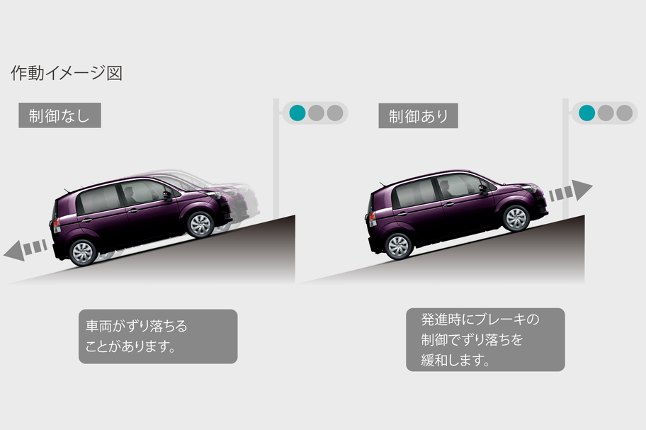 坂道での発進時、ブレーキからアクセルに踏み替える際に、ブレーキ油圧を保持することによって車両のずり落ちを緩和し、スムーズな発進を実現します。